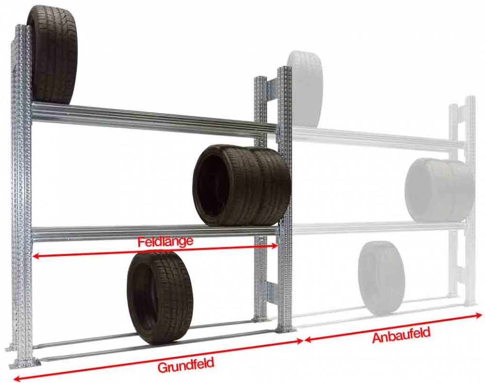 Reifen / Räder-Grund-Regal TSP 392 x 2500 mm (Tiefe x Höhe) (Breite inkl. Fußplatten: Feldlänge + 257 mm) mit 3 Lagerebenen für Reifen / Räder