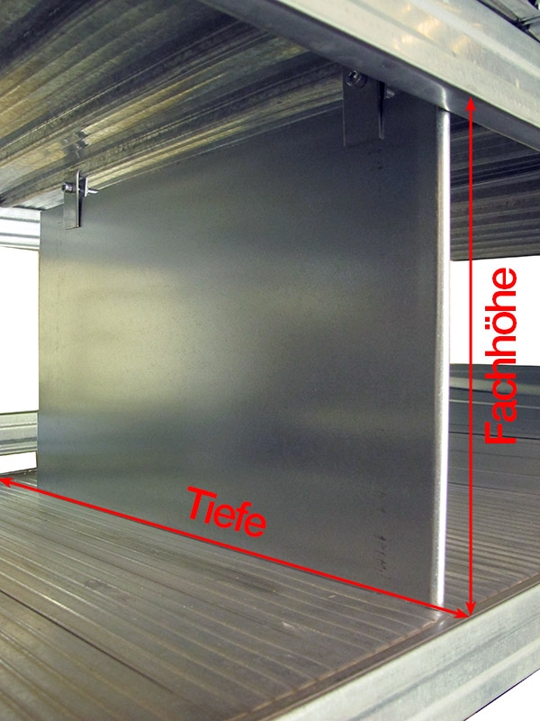 Mit den Fachteilern ist eine Unterteilung der Fachböden möglich. Sie werden in das untere Fachbodenpaneel gesteckt und am darüberliegenden Fachboden mit Klammern fixiert, Oberfläche : verzinkt